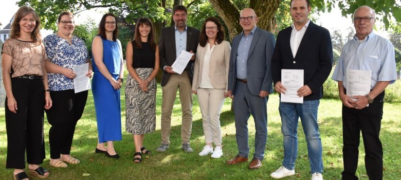 v.l.n.r.: Marion Fischer (Bewilligungsstelle im Landratsamt), Anne Aßmus, Ines Günther-Laake und Rekha Krings (IGO), Dr. Jürgen Jung und Bürgermeisterin Deirdre Heckler (Burglandschaft e.V.), Landrat Frank Matiaske, Max Janowicz (Therapiezentrum Janowicz) und Klaus Sauer (Gemeinde Höchst). Foto Stefan Toepfer/Kreisverwaltung