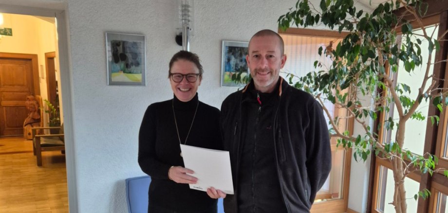 Bürgermeisterin Heckler bedankt sich mit einem kleinen Präsent bei Herrn Thiessen. Foto: Kommune