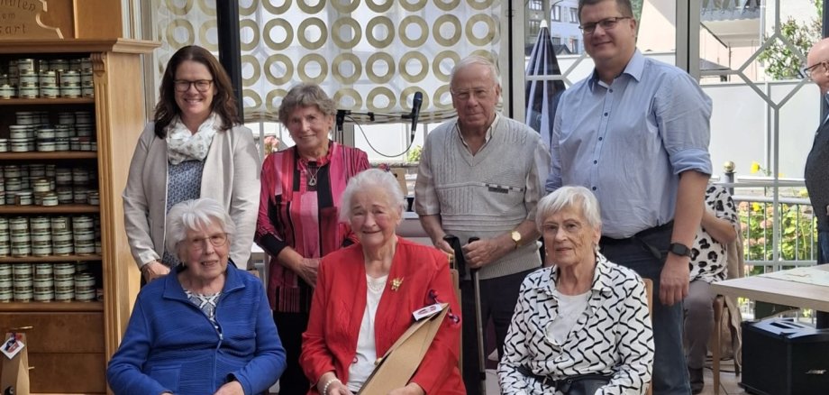 Sitzend v.l.n.r.: Marianne Knöll, Maria Steffen und Katharina Renner (alle Breuberg); stehend v.l.n.r.: Bürgermeisterin Deirdre Heckler (Breuberg), Apollonia (Loni) Löffler, Karl-Heinz Fertig und Bürgermeister Tassilo Schindler (alle Lützelbach). Foto: Kommune